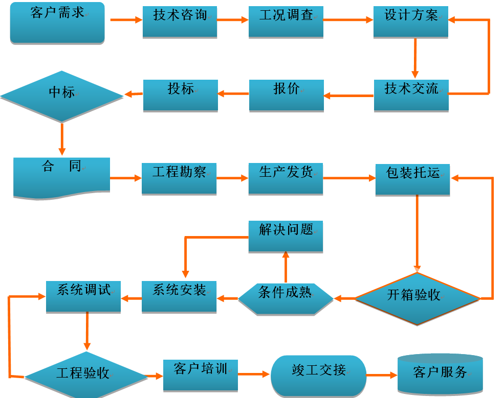 我公司經(jīng)過多年的經(jīng)驗總結(jié),形成了一套完整合理的客戶服務(wù)流程體系,服務(wù)流程包括銷售服務(wù)、系統(tǒng)設(shè)計、采購、生產(chǎn)、檢驗、工程實施、投運、維護(hù)等各個環(huán)節(jié)。公司對相關(guān)的服務(wù)流程持續(xù)的完善和優(yōu)化,使系統(tǒng)服務(wù)的質(zhì)量管理更加標(biāo)準(zhǔn)化、程序化、規(guī)范化,為系統(tǒng)服務(wù)工作奠定了扎實的基礎(chǔ)。